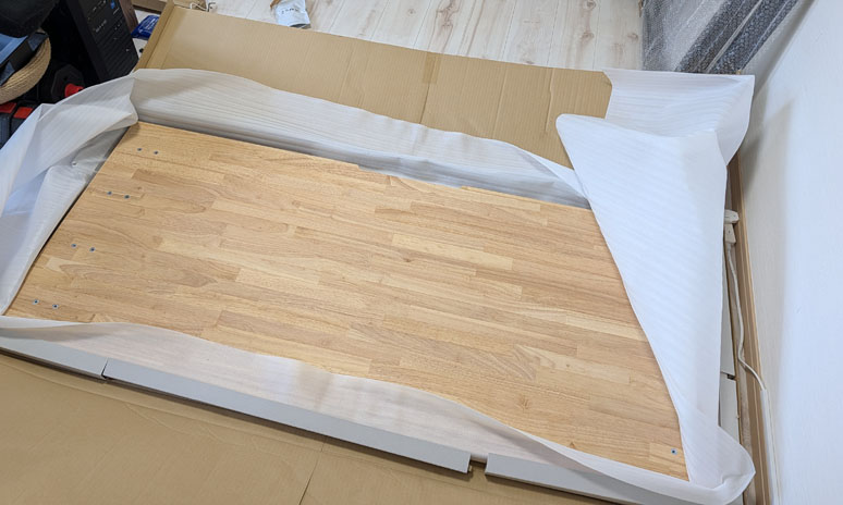 注文してから2週間ほど待ちました。天板と脚は発送元が別なので別送です。極力同じ日に届くように手配してもらえますが、私の場合は天板が先に来ました。本物の木目は温かみがあってやっぱり良い!厚みも3cmあって重厚感もあります。